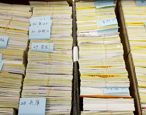 都道府県別に仕分けされた応募ハガキ。